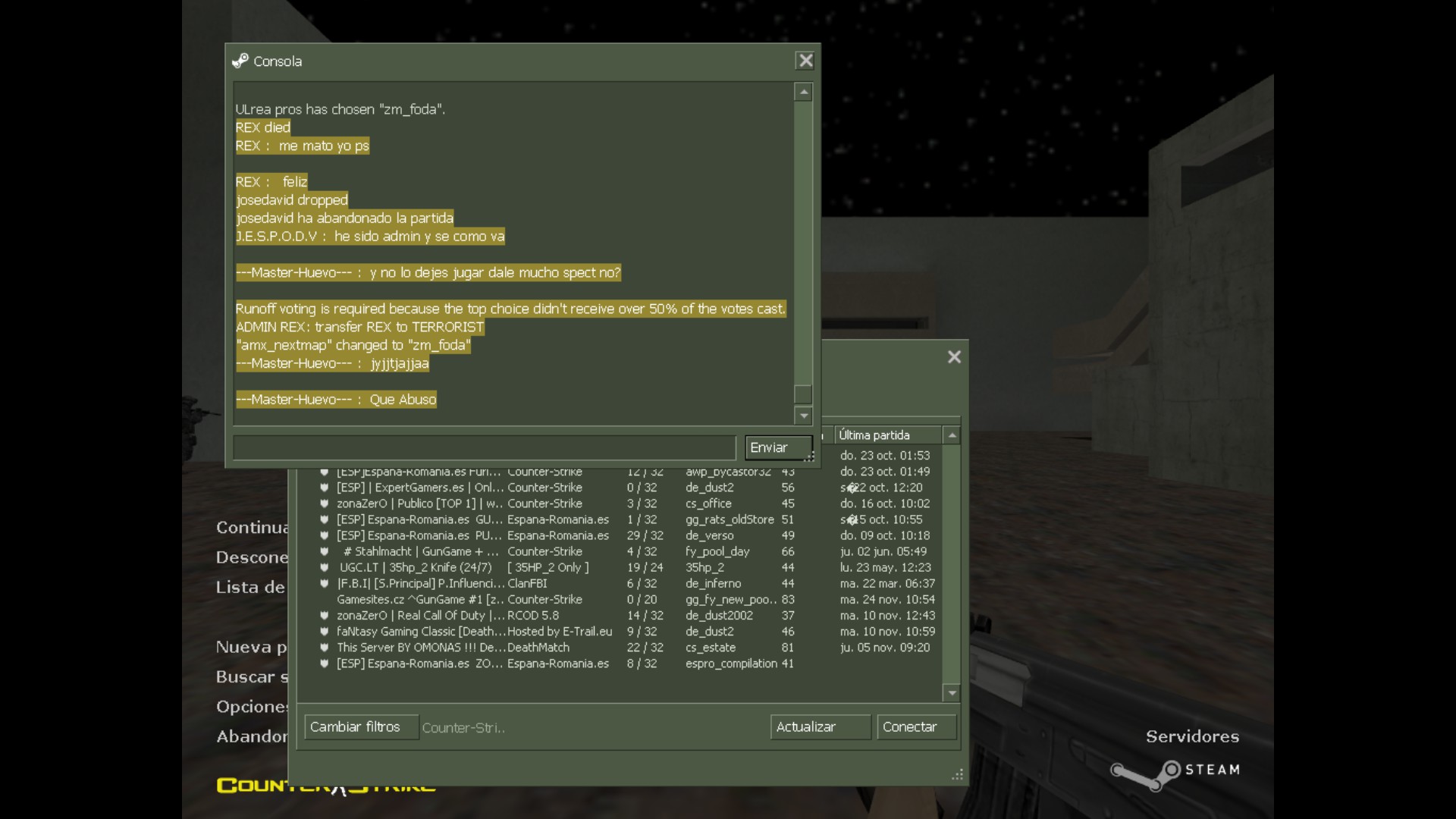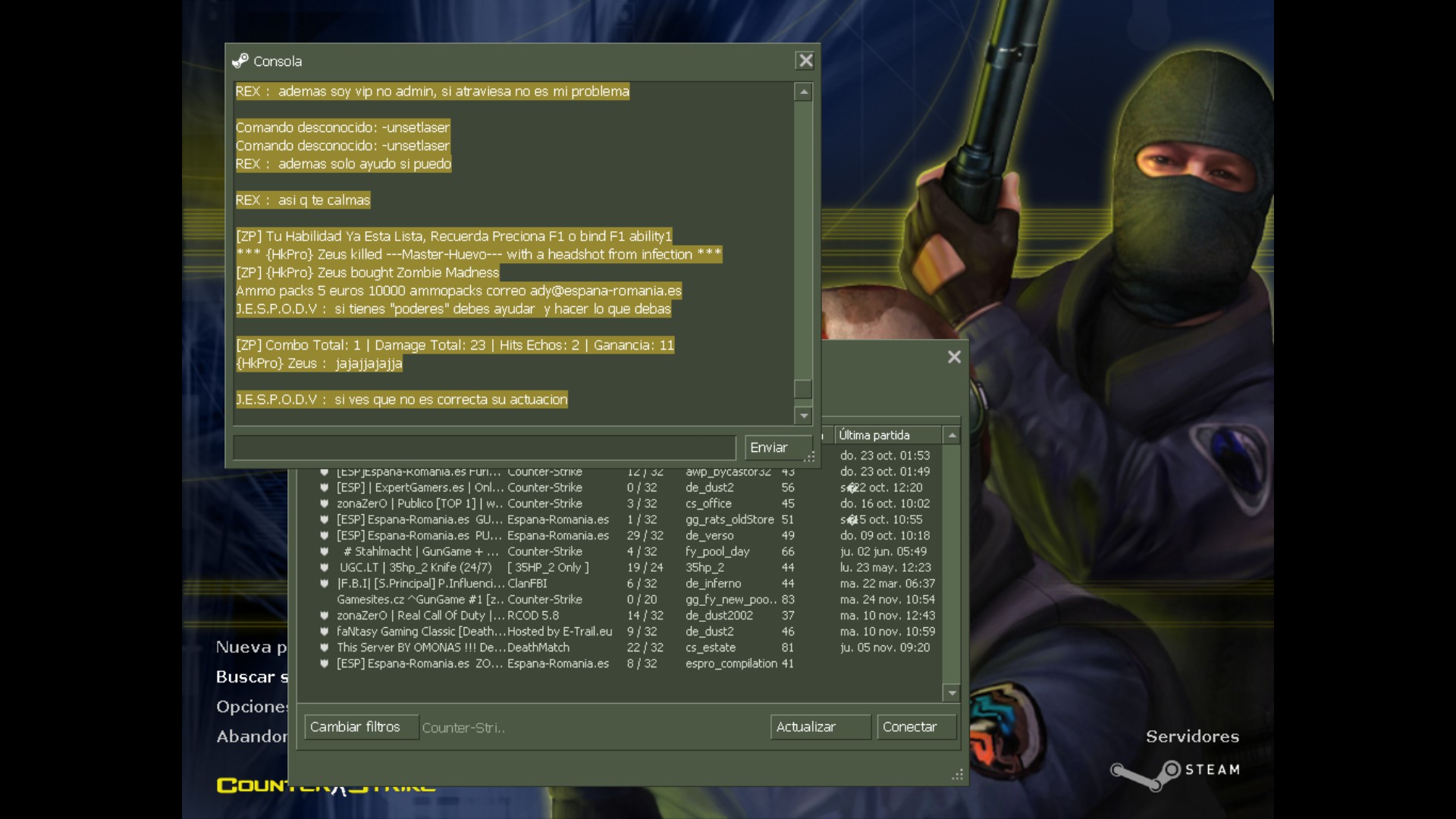 Bueno, me quejo de la actuacion del VIP REX o admin porque he visto que tiene poderes como admin para pasar a gente a spec y demas. El caso es que lleva avisando a gente durante varias partidas, alomejor algun seta de zombie que no sale y dice "a por humanos o castigo" con las letras de ADMIN en colorines, como advertencia de que si no entran tendran castigo.